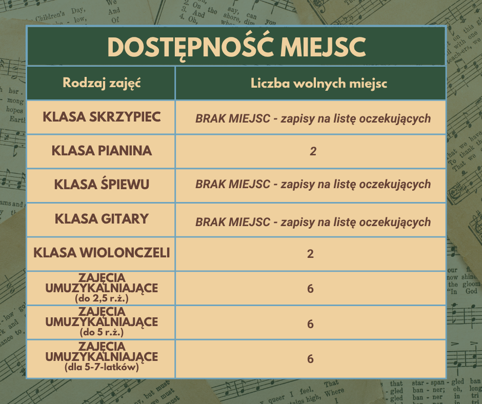 Dostępność miejsc na lekcje indywidualne oraz grupowe zajęcia umuzykalniające i plastyczne